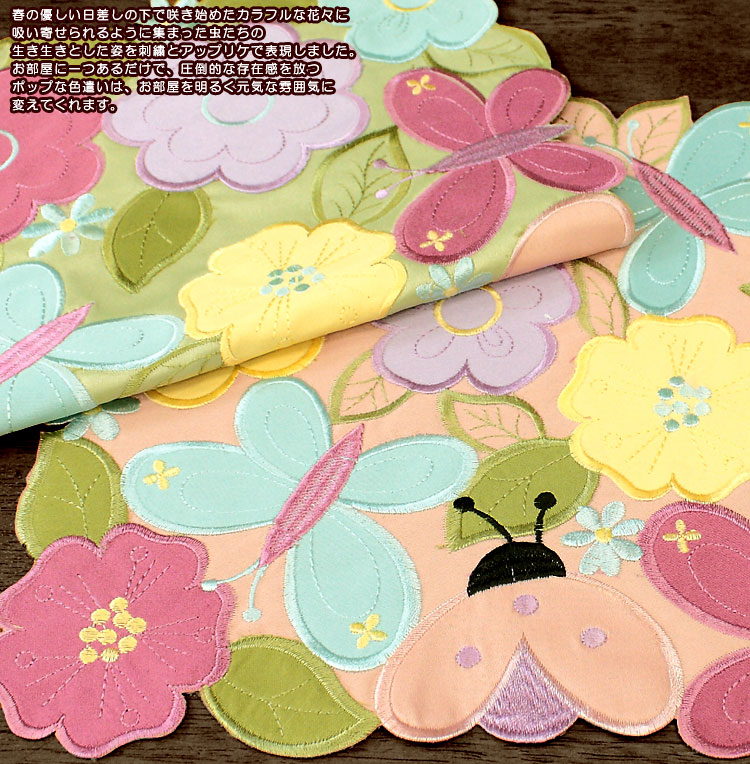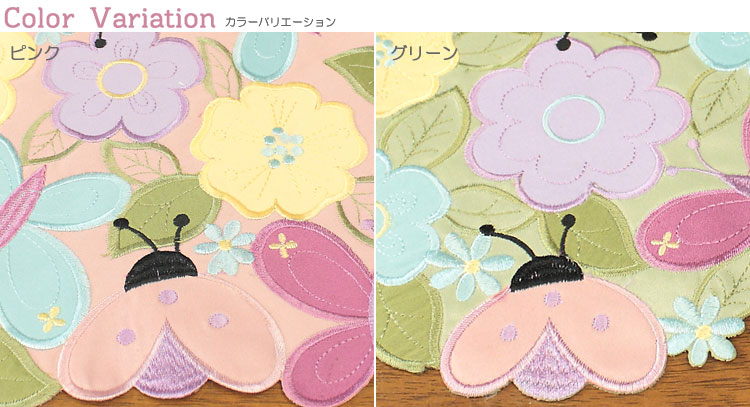 デザインコンセプト 春の優しい日差しの下で咲き始めたカラフルな花々に吸い寄せられるように集まった虫たちの生き生きとした姿を刺繍とアップリケで表現しました。