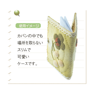 出来上がりサイズ : 約 縦 7.5cmX横10.5cm *商品の出来上がりサイズには若干の差が生じますキット内容 : 布(6種)・キルト綿・接着芯・レース・カードケース・スナップ釦・レース・刺しゅう糸(1種)・作り方説明書・実物大型紙(用意するもの)縫い針・まち針・ししゅう針・縫い糸(布に近い色)・しつけ糸・布に型紙を写す用具・定規・はさみ(布用、糸用、紙用)・厚紙(ハガキ程度の厚み)・アイロン※縫い糸は出来るだけ布に近い色をご用意下さい。