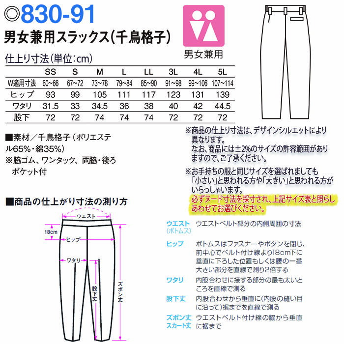 商品詳細 ■品名・品番 男女兼用スラックス(千鳥格子),830-91 ■カラー チドリ ■サイズ SS S M L LL 3L 4L 5L ■素材 千鳥格子/ポリエステル65%+綿35% ■機能・特長 男女兼用 ■仕様 脇ゴム,ワンタック,両脇・後ろポケット,別寸不可商品 ■着用シーズン オールシーズン ■メーカー・ブランド サンアロー / KAZEN(カゼン)・[旧]AP-RON(アプロン) お届け情報 メーカーお取り寄せの商品です。