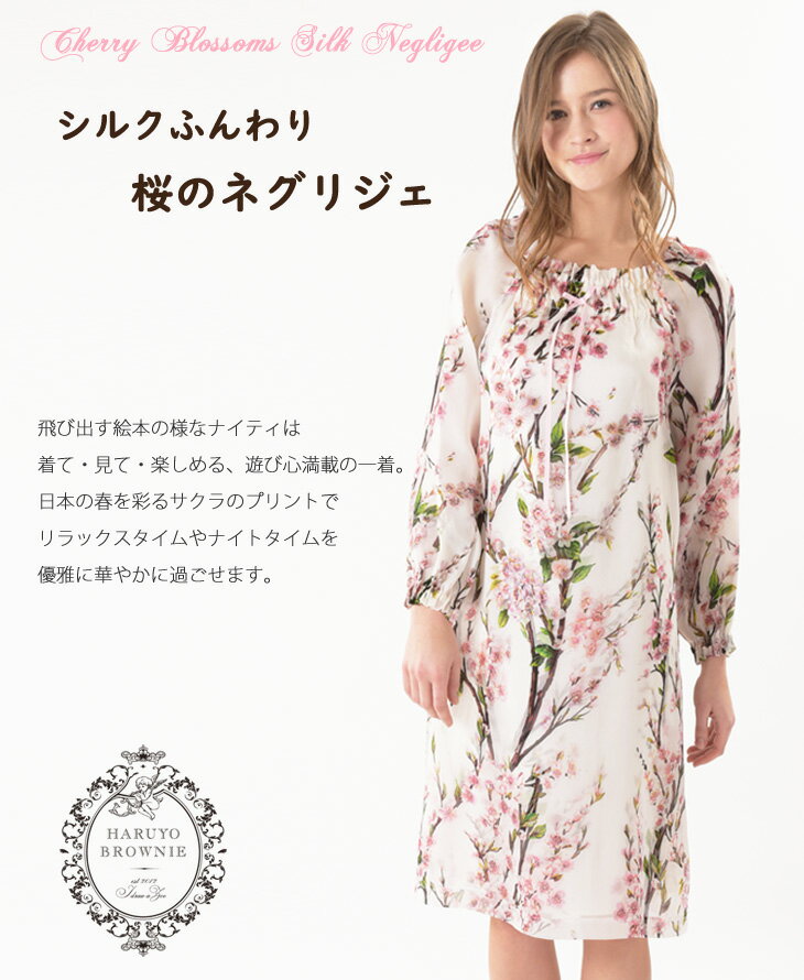 【送料無料】シルクふんわり桜のネグリジェ/HARUYO BROWNIE(ハルヨ ブラウニー)ナイティ パジャマ ルームウェア ナイトドレス 表地シルク100% プリントドレス ワンピース ワンマイル 寝巻 寝間着 日本の春を彩るサクラのプリントでリラックスタイムやナイトタイムを優雅に華やかに 2